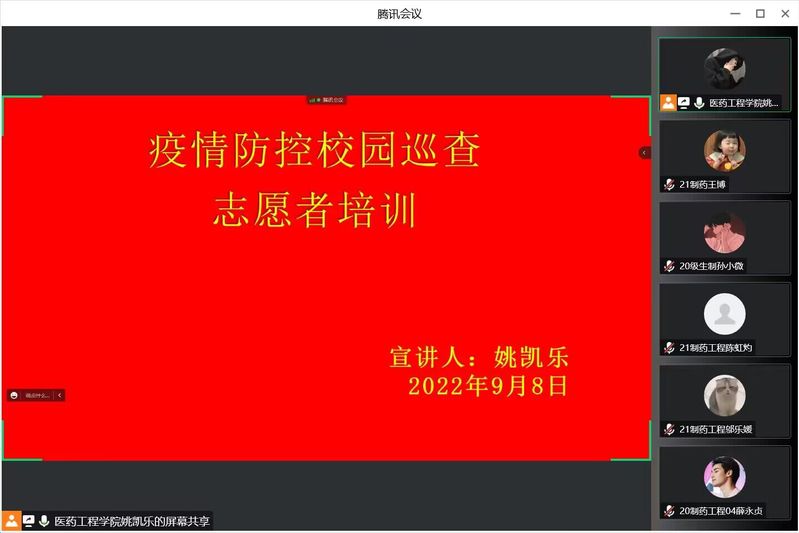 9月8日晚7:00,医药工程学院开展疫情防控下校园巡查志愿者线上培训会议。