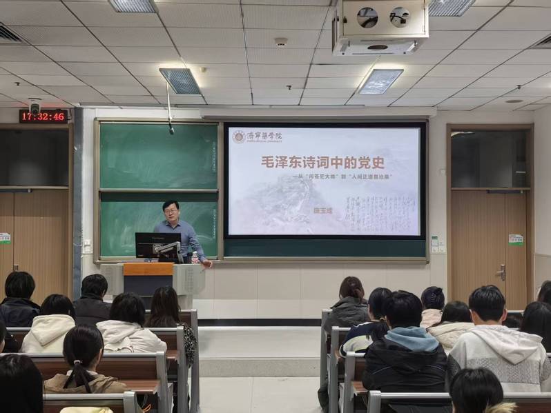 主题班会上,庞玉成以宏阔的历史视野和深厚的文化素养,引领同学们循着诗词的脉络,漫步于党史的长河,带领大家深入挖掘毛泽东诗词中蕴含的党史故事,他不仅解析了诗词的文学价值,更着重剖析其背后的重大历史事件、战略思想和哲学智慧,将一首首诗词还原为一幅幅生动的历史画卷。他希望同学们,要从毛泽东诗词中读懂历史的选择、人民的力量,要将这份宝贵的精神财富内化为勤奋学习、立志报国的强大动力,在新时代的征程上,书写属于青年一代的崭新篇章。
